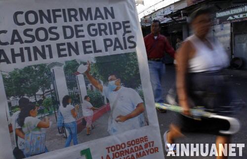 5月4日, 在薩爾瓦多首都圣薩爾瓦多,一名當(dāng)?shù)厝藦囊粋(gè)關(guān)于甲型H1N1流感疫情的告示牌前走過。薩爾瓦多目前已有兩名患者被證實(shí)感染甲型H1N1流感病毒,政府稱已經(jīng)采取相應(yīng)措施以防止疫情擴(kuò)散。 新華社發(fā)(奧斯卡·斯里維拉攝)