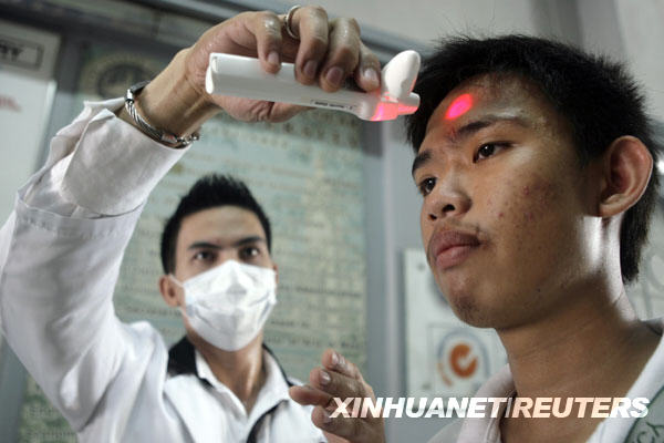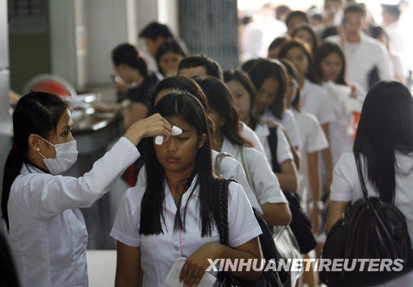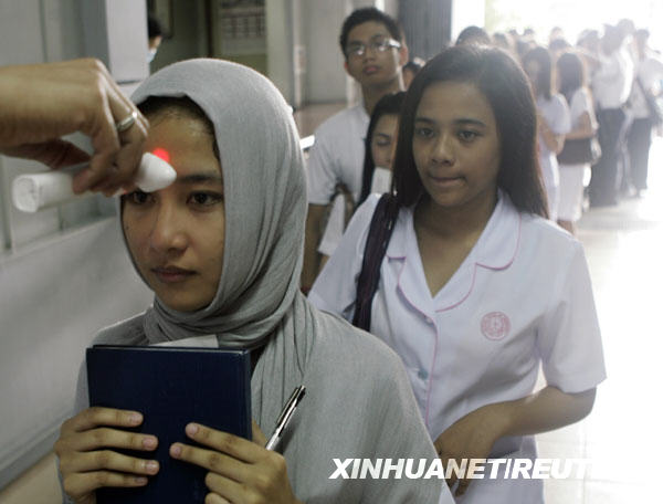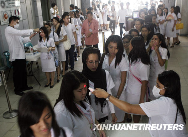 6月15日,在菲律賓首都馬尼拉的一所大學,學生們?nèi)胄G敖邮荏w溫測量,以防范甲型H1N1流感疫情。截至北京時間6月15日14時,世界衛(wèi)生組織共確認菲律賓甲型H1N1流感確診病例77例。新華社/路透