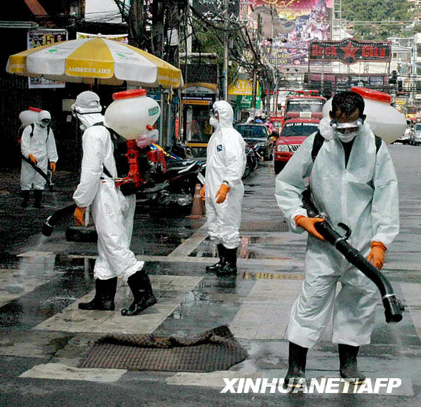 6月14日,工作人員在泰國普吉島的一條街道上噴灑消毒劑,以防范甲型H1N1流感疫情。截至北京時間6月15日14時,世界衛(wèi)生組織共確認(rèn)泰國甲型H1N1流感確診病例8例。新華社/法新