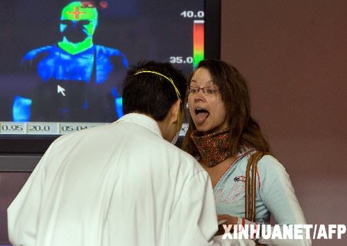 2009年5月5日 墨西哥已確診甲型H1N1流感患者人數(shù)增至776人 5月4日,在墨西哥首都墨西哥城的貝尼托華雷斯國(guó)際機(jī)場(chǎng),一名墨西哥乘客接受健康檢查。墨西哥政府當(dāng)日晚宣布,墨全國(guó)已確診甲型H1N1流感患者人數(shù)776人,死亡26人。新華社/法新