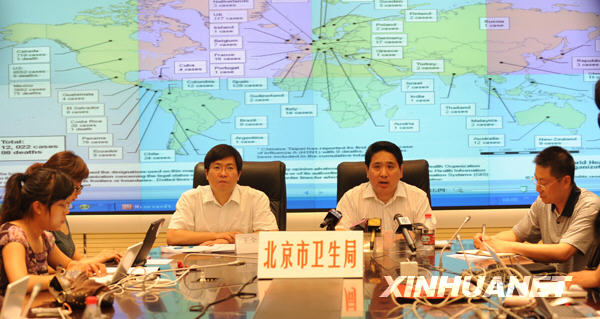 5月24日,北京市疾控中心主任鄧瑛(右二)、北京市疾控中心傳染病地方病控制所所長王全意(右三)在新聞發(fā)布會上介紹情況。當日21時,北京市衛(wèi)生局通報,北京市報告一例甲型H1N1流感疑似病例,如果被確診,這將是北京市出現(xiàn)的第5位確診患者。