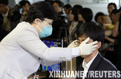 4月28日,在韓國(guó)仁川機(jī)場(chǎng),工作人員為抵達(dá)機(jī)場(chǎng)的乘客檢查體溫。韓國(guó)疾病管理本部28日表示,一名從墨西哥旅行歸來(lái)的韓國(guó)人被確認(rèn)為豬流感疑似患者,這是韓國(guó)首例豬流感疑似病例。 新華社/路透