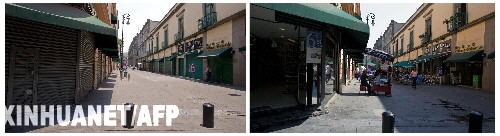 墨西哥城政府5月6日晚間宣布,鑒于目前甲型H1N1流感疫情穩(wěn)定,墨西哥城政府決定將警戒級由原先的橙色較高級降為黃色中級。這張拼版照片顯示的墨西哥首都墨西哥城菲洛梅諾馬塔街上餐館大門緊閉(左,攝于5月2日)和5月6日餐館重新開門迎客(右)的景象。 新華社/法新