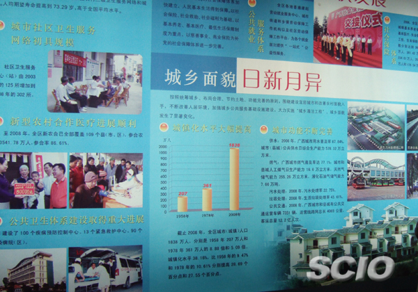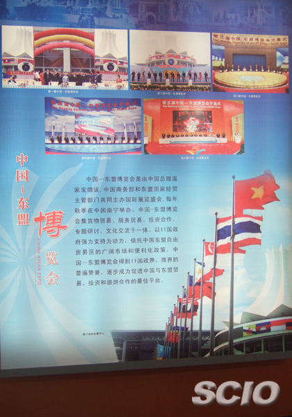 廣西解放以后尤其是改革開放以來,充分利用自身的地理優(yōu)勢,力爭把廣西建設(shè)成為區(qū)域經(jīng)濟合作新高地、中國沿海經(jīng)濟發(fā)展新一級。在展廳中,抓住“中國—東盟博覽會的巨大商機”,“打造西江億噸黃金水道”等展臺和模型,充分向參觀者展示了這片古老的土地充滿活力的一面。貼在苗寨小屋上的一幅對聯(lián)更是充分體現(xiàn)了廣西各族人民團結(jié)一致,全面建設(shè)小康社會的巨大熱情,上聯(lián)是:五谷豐登壯鄉(xiāng)苗寨春來早 ;下聯(lián)是:六畜興旺八桂大地氣象新,橫批:沐浴黨恩。