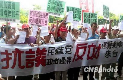 8月29日,勞動黨等10余個(gè)臺灣民間團(tuán)體前往臺北的民進(jìn)黨中央黨部,抗議該黨為政治利益、操弄達(dá)賴?yán)飦砼_一事。圖為當(dāng)天上午,勞動黨、中國統(tǒng)一聯(lián)盟等各團(tuán)體近百位人士在北平西路民進(jìn)黨中央黨部所在大樓前舉起“救災(zāi)重建優(yōu)先、政治操弄可恥”、“臺獨(dú)加藏獨(dú),破壞兩岸和平”等標(biāo)語牌,進(jìn)行抗議活動。 中新社發(fā) 劉舒凌 攝
