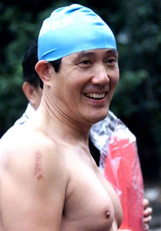 在泳池邊上大秀胸肌馬英九愛好運動,給人以身體健康的印象。