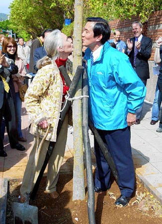 馬英九與支持者隔著小樹“接吻”,逗樂圍觀人群。馬英九憑借俊朗的外形在臺灣有“女性殺手”之稱,常被瘋狂的支持者擁抱。