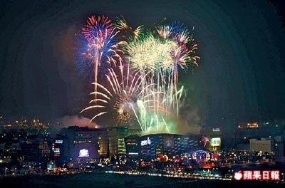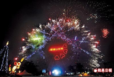 中國臺灣網1月1日消息 據臺灣《蘋果日報》報道,不讓臺北101大樓專美,2010年的第一刻,臺灣中、南部的天空也同步開出燦爛煙花。高雄夢時代廣場長達199秒的跨年煙火秀,1萬8000發(fā)萬紫千紅的煙火,與夢時代摩天輪車廂LED燈相互輝映,現場50萬人齊呼:“新年快樂!”云林劍湖山和高縣義大世界都上演摩天輪煙火秀,劍湖山摩天輪更射出10顆心心和“LOVE 2010”圖樣,現場情侶都忘情用熱吻迎接新的一年。