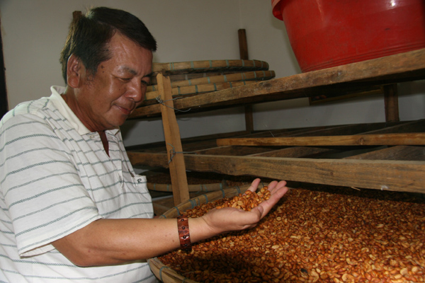 林文定向記者介紹經(jīng)過曬干粗加工后的咖啡豆(攝影 邵磌)