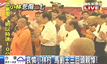 馬英九、臺當(dāng)局“行政院長”劉兆玄和臺灣“立法院長”王金平等人,22日上午參加高雄縣甲仙鄉(xiāng)小林村罹難者祈福追思法會。來源:臺灣TVBS電視臺