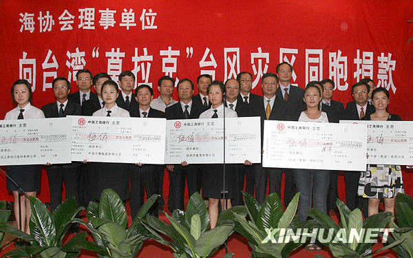 8月12日,海協(xié)會(huì)理事單位向臺(tái)灣“莫拉克”臺(tái)風(fēng)災(zāi)區(qū)同胞捐款儀式在北京舉行,首批共18家理事單位合計(jì)捐款1.06億元人民幣、500萬(wàn)元港幣。新華社記者 邢廣利 攝