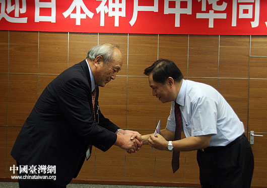 8月25日晚,日本神戶中華同文學(xué)校修學(xué)旅行團通過全國臺聯(lián)向臺灣南部災(zāi)區(qū)捐款約5萬元人民幣。圖為全國人大常委、全國臺聯(lián)會長梁國揚(右)從修學(xué)旅行團帶隊老師手中接過捐款,并表示感謝。(中國臺灣網(wǎng) 鐘寶華 攝)