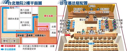 地檢署規(guī)劃,吳淑珍在下午2點20分能從地檢署門口下車,在搭乘法警室旁邊的電梯,直接進到第七法庭。