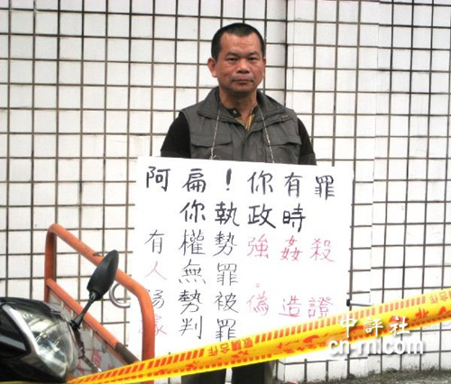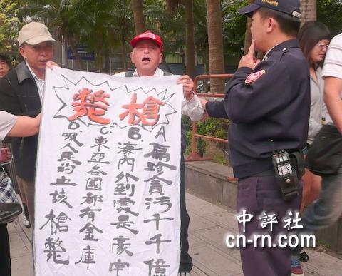 陳水扁委任律師鄭文龍?jiān)诮邮苡浾咴L問時(shí),一位反扁的老伯伯在一旁不停高喊“槍斃陳水扁”,引來警察的注意。警察隨后勸離這位老先生,老先生還從包包里掏出準(zhǔn)備好的反扁布條,引起一陣小小的騷動(dòng)。