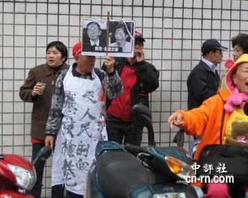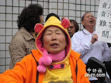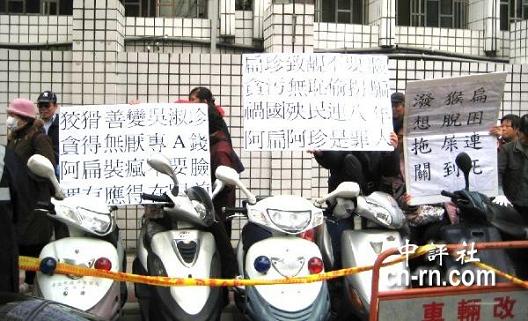 據(jù)中評社報道,臺北地方法院今天起一連三天開庭審理扁家弊案,被告吳淑珍下午坐著輪椅出庭。法院外嗆扁群眾雖然只有10余人,但都有備而來,有人穿豬頭裝、有人自制白色圍兜、拿扁珍照片,還有人高舉大字報嗆扁珍,十分投入。