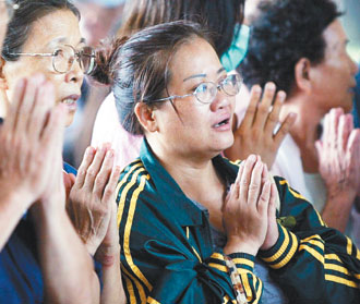 等不到親友安全歸來(lái)的焦急民眾,昨天在高雄縣旗山中學(xué)與慈濟(jì)義工合十禱告。圖片來(lái)源:臺(tái)灣《聯(lián)合報(bào)》