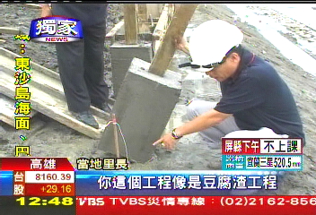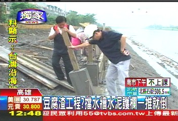 中國臺灣網(wǎng)10月22日消息 據(jù)臺灣TVBS電視臺報道,臺風(fēng)“鲇魚”使得在919水災(zāi)中受淹最嚴重的高雄市民再次神經(jīng)繃緊。今日下午,高雄市楠梓地區(qū)里長向高雄市政府提出抗議,他表示高雄市后勁溪擋水墻工程是“豆腐渣工程”,用2根手指就可以推到,若臺風(fēng)“鲇魚”來襲,后果不堪設(shè)想。