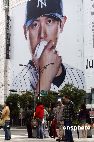 資料圖:臺北西門町街頭的臺灣著名棒球選手王建民的巨幅廣告格外醒目。目前效力于美國著名職業(yè)棒球隊紐約洋基隊的王建民被譽為“臺灣之光”。投球手王建民自打入美國職業(yè)棒球聯(lián)賽以來,不斷創(chuàng)出輝煌戰(zhàn)績,成為耀眼的棒球明星、臺灣“萬人迷”。 中新社發(fā) 張煒 攝