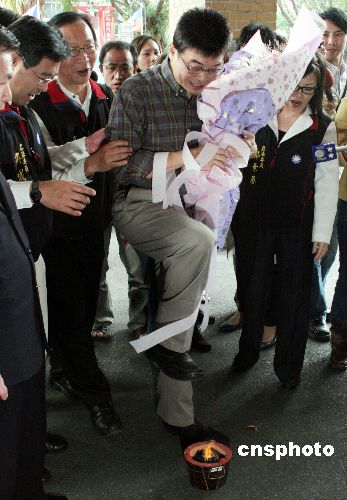 邱毅從坐牢地點(diǎn)高雄到臺(tái)北后,返回“立法院”,同黨“立委”依習(xí)俗,安排跨火爐儀式,去霉氣。