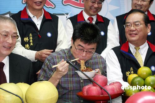 圖為邱毅從坐牢地點(diǎn)高雄到臺(tái)北后,返回“立法院”,同黨“立委”依習(xí)俗送上柚子、蘋(píng)果及橘子,分別代表“保佑、平安及吉利”,并端上一碗豬腳面線,希望幫邱毅去掉霉氣并補(bǔ)壽。