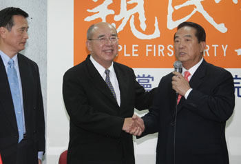 親民黨主席宋楚瑜(右)、國民黨主席吳伯雄(中)19日在親民黨“立法院”黨團宣布,“立委”馮定國(左)以大局為重,退出臺中縣“立委”選舉。來源:“中央社”