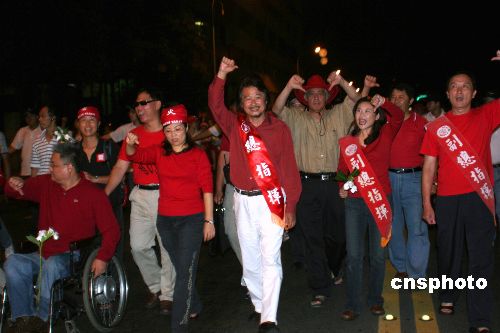 資料圖:2006年9月27日晚,參加臺灣“百萬人反貪腐運(yùn)動(dòng)”民眾二度移師臺北車站繼續(xù)靜坐。圖為運(yùn)動(dòng)總召集人、民進(jìn)黨前主席施明德(中)率民眾從凱德格蘭大道轉(zhuǎn)往臺北車站的情形。 中新社發(fā) 黃少華 攝