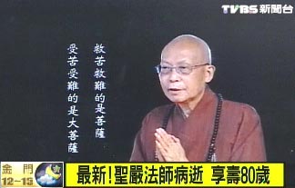 臺灣法鼓山創(chuàng)辦人圣嚴法師近年來疾病纏身,健康狀況一直不甚理想,最后還是不敵病魔,于今天下午4點04分,病逝臺大醫(yī)院,享壽79歲。(高大林)