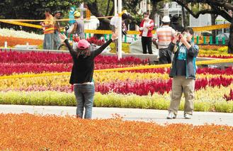 民眾高興的在花海前拍照,工作人員在一旁忙著繼續(xù)趕工。圖片來(lái)源:臺(tái)灣聯(lián)合報(bào)