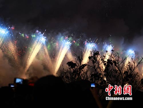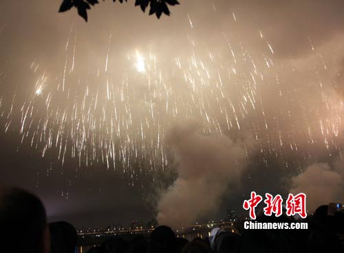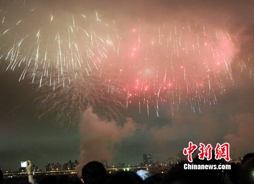 11月6日,臺(tái)北花博會(huì)今天開幕。主辦單位自晚間9時(shí)開始,從大佳河濱公園施放煙火,再一路沿著基隆河、淡水河串連到壓軸的大稻埕碼頭,吸引很多民眾觀看。圖為在大稻埕碼頭施放的煙火。
