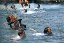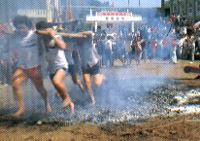 過(guò)火儀式在大陸閩南一帶行之久遠(yuǎn),多半是伴隨寺廟的祭典舉行。臺(tái)灣的宗教信仰沿襲自閩南,故各地也時(shí)有過(guò)火儀式,但論及規(guī)模,當(dāng)屬臺(tái)北縣萬(wàn)里鄉(xiāng)野柳村所舉行的最為盛大隆重。這種水里來(lái)又火里去的酬神儀式年年不斷。 野柳保安宮在海年農(nóng)歷正月十五舉行過(guò)海過(guò)火儀式,除了本地人動(dòng)員投入外,外地人也能參加。過(guò)海儀式首先進(jìn)行,抬轎組先抬著神輿在廟前繞行,道士在一旁誦經(jīng)祈禱,待抬轎的信徒進(jìn)入渾渾噩噩的起乩狀態(tài)時(shí),道士一聲令下,轎夫便紛紛抬著神轎跳入海中,游過(guò)約100公尺后,抬轎上岸,然后向預(yù)定過(guò)火的地點(diǎn)跑。 過(guò)火之前同樣也有一連串的儀式。首先由道士向火禱告,祈求平安順利,然后以草席在火堆四周揮舞,象徵驅(qū)魔;再以鹽和米撒入炭火降溫。此時(shí),抬轎組開(kāi)始繞著火堆跑,邊跑口中邊發(fā)出囈語(yǔ),不久,在道士一個(gè)信號(hào)下,神轎開(kāi)始過(guò)火,隨后一些信徒或身體有恙者也紛紛沖進(jìn)火堆。 儀式完成后,神轎在信徒的簇?fù)硐,在野柳的大街小巷?nèi)巡行驅(qū)魔,待神轎回宮,整個(gè)活動(dòng)才告落幕。 乘車(chē)風(fēng)向標(biāo):