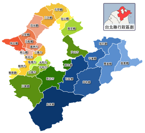 臺北縣的行政區(qū)范圍,源自日據(jù)時期設置的臺北州;當時臺北州的范圍涵蓋今日的臺北縣、宜蘭縣與臺北市、基隆市,共設置海山郡、新莊郡、七星郡、淡水郡、基隆郡、文山郡、宜蘭郡、羅東郡等8郡。