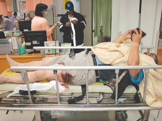 新竹縣議員候選人羅吉坤,昨晚遭歹徒開槍射擊,子彈貫穿左大腿,流血不止;他躺在病床上忍著痛電告支持者,會堅持下去。 圖片來源:臺灣《聯(lián)合報》