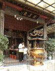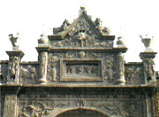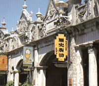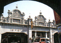立面上鮮活的瑞獅、鯉躍龍門、獅子望月等動物雕塑,栩栩如生,并飾以象征平安的如意、花卉靜物,兩旁對聯(lián)以黑色陶片粘貼成,充滿了中國風(fēng)味。