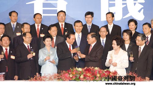 簽約后陳云林和江丙坤碰杯慶祝協(xié)議簽署成功。中國臺(tái)灣網(wǎng) 田云鵬攝