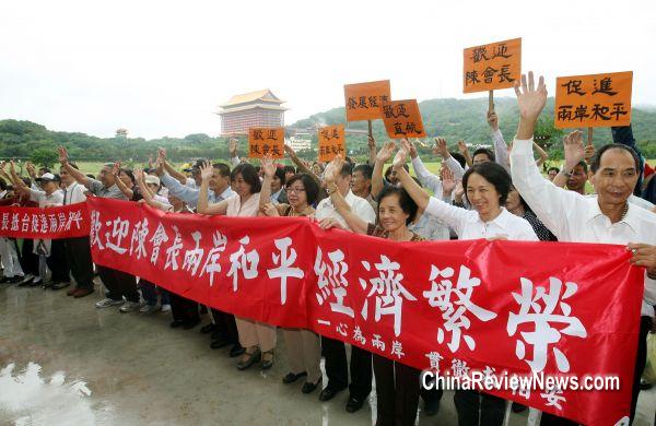 大陸海協(xié)會會長陳云林到臺,臺灣的民間團體“中華兩岸事務(wù)交流協(xié)會”發(fā)動支持者到陳云林下榻的圓山飯店下方河濱公園,舉布條歡迎。圖片來源:臺灣“中央社”