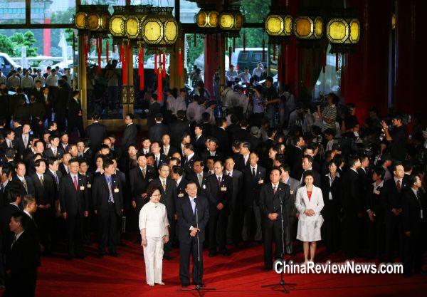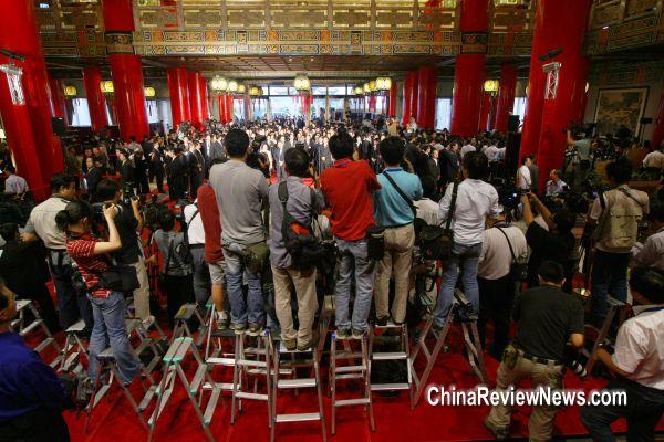 大陸海峽兩岸關(guān)系協(xié)會會長陳云林三日率協(xié)商代表團到臺。大批媒體記者在臺北圓山飯店采訪。圖片來源:臺灣“中央社”