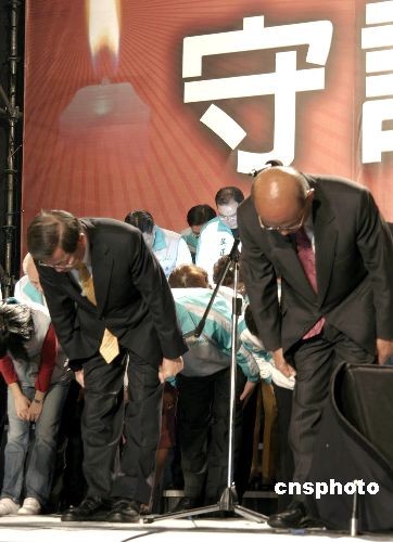 臺(tái)灣地區(qū)領(lǐng)導(dǎo)人選舉二十二日晚揭曉,謝長(zhǎng)廷、蘇貞昌等民進(jìn)黨競(jìng)選團(tuán)隊(duì)承認(rèn)敗選,并在競(jìng)選總部前廣場(chǎng)向支持者表達(dá)謝意。