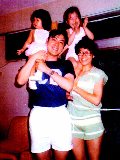 老照片:馬英九夫婦穿家居短衫短褲,將兩個女兒扛在肩上,大女兒馬唯中高興地拍手,享受平凡家庭的天倫之樂。