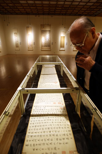 第7屆漢字文化節(jié)20日在“中正紀(jì)念堂”舉行,推出“四百年時(shí)空名家書法展”,展出媲美故宮文物的書法家真跡。 圖片來源:“中央社”