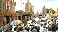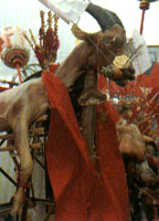 新埔枋寮義民廟于每年農(nóng)歷7月20日舉行的義民節(jié)活動,是臺灣客家人一年當(dāng)中最重要的盛典,也是本省目前保存較完整的民俗祭典之一。每逢此日,來自全省的客家鄉(xiāng)親總將義民廟擠得水泄不通,而放水燈、賽神豬及羊角競長等祭祀活動,更將活動烘托得熱鬧非凡。 義民節(jié)祭祀活動起源于清道光15年(1835年),附近各大莊為了紀(jì)念先烈義行,便選定農(nóng)歷7月20日舉行祭典,由各大莊輪值祭祀。輪值的莊頭除了要主持祭典外,還要負(fù)責(zé)牲品,安排戲班及設(shè)宴請客,由于每個(gè)村莊隔15年輪值一次,所以每一莊頭無不竭盡全力將祭典辦得熱熱鬧鬧,其中不乏有互相較勁的意味。 每到義民節(jié)前夕,輪值的莊頭便家家戶戶張燈結(jié)彩,殺羊宰豬迎接這天的來到。大體說來,義民節(jié)最主要的目的在超渡死難義民,同時(shí)亦超渡一般游魂,故在精神層面上與中元普渡相去不遠(yuǎn),祭典活動也與基隆中元祭相仿,有放水燈、起燈篙、糊大士爺、神豬競重、羊角競長及普渡等活動。 祭典通常為農(nóng)歷7月18~20日,第一日為“入壇”,廟前即登起高達(dá)數(shù)丈的燈篙,招請諸方神明及各路野鬼來,廟門前尚請專司供品分配的鬼王——大士爺坐鎮(zhèn),并舉行祭祀,誦經(jīng)聲終日不斷;第二日于廟前的鳳山溪施放水燈,超渡水中孤魂,引渡西方極樂世界,每年值此夜晚,鳳山溪畔萬頭攢動,溪中燈火連綿成河,場面之大不下于基隆中元祭。 7月20日是祭典的最高潮,鄉(xiāng)民們以豬、羊、雞、鴨等牲禮普施,供祭孤魂野鬼,祭典中少不了各種陣頭表演,其中客家山歌競唱更將客家風(fēng)情展現(xiàn)無遺,所有的祭典活動中最引人矚目的莫過于賽神豬及羊角競長,名列前茅的大豬公及老山羊,皆以華麗的高塔裝飾,所有得獎(jiǎng)的牌匾懸掛兩側(cè),每只神豬均達(dá)千斤以上,羅列于廟埕之前,場面十分壯觀;而老山羊則眼戴墨鏡、口銜煙斗,一副老紳士的打扮,十分有趣。神豬與老羊皆于20日當(dāng)天中午12點(diǎn)至下午3點(diǎn)間陳祭廟前,并在傍晚列于街道,供人參觀。普渡大約在下午4點(diǎn)左右結(jié)束,此時(shí)廟前雜耍、賣藝的攤販,看戲、進(jìn)香的人潮逐漸散去;但輪值村莊上盛大的宴席才正要開始,直到午夜時(shí)分,大士爺像在熊熊火焰中化為灰燼,一年一度的義民節(jié)盛典才告正式落幕。
