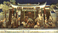 嘉義是臺灣交趾陶的發(fā)源地,因而有“交趾陶的故鄉(xiāng)”之稱,日人又稱之為“嘉義燒”。交趾陶為一種低溫多彩釉,是融合了軟陶與廣窯的一種陶藝,且包容了捏塑、繪畫、燒陶等技藝及宗教文化的民俗工藝,堪稱民間藝術的國寶。 據(jù)考證,交趾陶發(fā)源于兩廣福建一帶,清時隨移民傳入臺灣。臺灣的交趾陶主要作為廟宇或傳統(tǒng)建筑中的裝飾,多飾于廟宇建筑的屋頂、墻壁上的水車堵、身堵、墀頭,而題材多半以教化人心的忠孝節(jié)義及吉祥獻瑞等為主,其人物的身段、服飾則深受地方戲曲及歌仔戲的影響,不論人物或鳥獸、花卉的造型、用色,皆十分鮮艷生動而活潑,其特色在于晶亮艷麗的寶石釉彩,呈現(xiàn)多元豐富的民俗風格。 而在傳入臺灣的150年間,由于交趾陶的制作技巧難度高,因此習得此藝的匠師寥寥可數(shù),其中以尊為“葉王”的葉麟趾,為臺灣交趾陶的開山宗師。其作品還曾在世界博覽會中引起藝壇的震驚,被譽為臺灣絕技,后世尊為“臺灣交趾陶之父”,其作品散見于嘉南一帶各大廟宇,如今僅剩臺南學甲“慈濟宮”、佳里“震興宮”及嘉義“城隍廟”等地保留較完整;其作品造型豐富、沉逸古拙,尤以人物栩栩如生,用色沉斂穩(wěn)健,并獨創(chuàng)胭脂紅、翠綠顏色的釉料,后世更有“葉王交趾燒”之封譽。 同樣是寺廟裝飾要角的剪粘,主要飾于廟頂,常與交趾陶互為搭配。 近年來,本土意識覺醒,臺灣民俗傳統(tǒng)工藝日漸復興,交趾陶藝術再度受到重視,這項失落的民間工藝獲得重生。