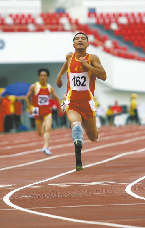 幸運(yùn)的是,賈天雷剛剛?cè)ケ本┌惭b了新的假肢。他的右膝蓋以下,重裝了更加輕便、彈力也更出色的假肢。因而現(xiàn)在雖然還處于適應(yīng)期,但賈天雷對比賽很有信心!拔移谕100米能進(jìn)前三,我也相信自己的實(shí)力。希望能取得好成績,回報(bào)東莞市殘聯(lián),回報(bào)東莞人民對我的恩情!