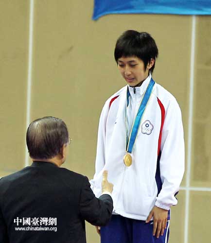 在17日廣州亞運會跆拳道女子46公斤決賽中,中華臺北隊17歲的小將黃顯詠為中華臺北隊再添一金,登上最高領(lǐng)獎臺。圖為頒獎嘉賓向其豎起拇指表示贊賞。(中國臺灣網(wǎng) 鐘寶華 攝)