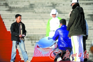 昨天的北京一掃前日的大霧氣,天高云淡,寒風(fēng)凜冽。在世紀(jì)壇靠近頂端的臺(tái)階上,搭建了一個(gè)紅色的采火臺(tái)。17名少女身著白色的羽絨衣,列隊(duì)演練,不斷熟練地跟隨采火使者緩緩步下臺(tái)階的節(jié)奏和路線(xiàn)。看起來(lái),她們中不止一人來(lái)自新疆。但只有一名長(zhǎng)發(fā)女子一直在周嘉威周?chē),反?fù)演練采火的動(dòng)作與行進(jìn)的路線(xiàn)。