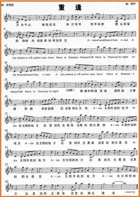 《重逢》突出了亞運會的理念:亞運會不僅是亞洲的體育盛會,也是亞洲兄弟姐妹四年一次的友誼聚會。歌詞“眼睛和眼睛重逢”,“珠江彎彎伸手相牽”、“隔山遙望,跨海相約”寓意深遠,表明亞洲雖然地域遼闊,但亞洲人民之間深厚的友誼縮短了彼此的距離!爸榻瓘潖澤焓窒酄俊币魳凡糠钟脧V東童謠《落雨大》作為前奏,突出了濃濃的廣東特色。Asia(亞洲)一詞原意是“太陽升起的地方”,《重逢》用“Asia,太陽升起的地方。Asia,古文明的殿堂。啊,這里的風光最美。啊,這里的陽光最亮”。四句將歌曲推向高潮。