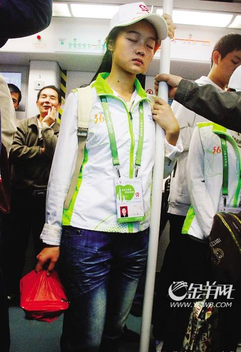 嬌弱身軀,稚嫩面龐,地鐵里站著倚桿睡著了,一臉倦累,手中還拎著個(gè)盒飯。衣服和胸牌顯示了她的身份:廣州亞運(yùn)志愿者。這一幕,被有心人拍了下來(lái),掛上網(wǎng)。她迅速躥紅,并被稱(chēng)為“最美的‘亞運(yùn)妹妹’”。