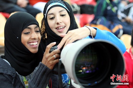 亞運(yùn)會(huì)不只是運(yùn)動(dòng)員競(jìng)技的舞臺(tái),五湖四海的觀眾也匯集在這里,傳遞著友誼和歡樂(lè)。圖為兩位來(lái)自也門(mén)的美女對(duì)記者的“大炮”鏡頭產(chǎn)生了興趣。 中新社記者 張雷 攝