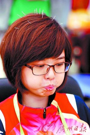 在圍棋女團預(yù)賽中,韓國選手李瑟娥“針灸戰(zhàn)法”升級,10余銀針扎頭。