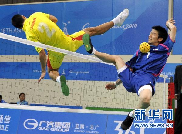 11月25日,中國選手楊家鵬(左)在比賽中攔截日本選手寺本進的進攻。當日,在廣州舉行的第16屆亞運會藤球男子雙人預(yù)賽中,中國隊以0比2不敵日本隊。新華社記者陳曄華攝