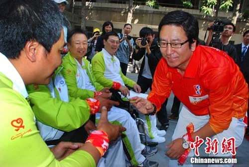 5日,廣州亞殘運(yùn)會(huì)形象大使、央視知名主持人白巖松與亞殘運(yùn)殘疾人志愿者打招呼。 作 者:程景偉